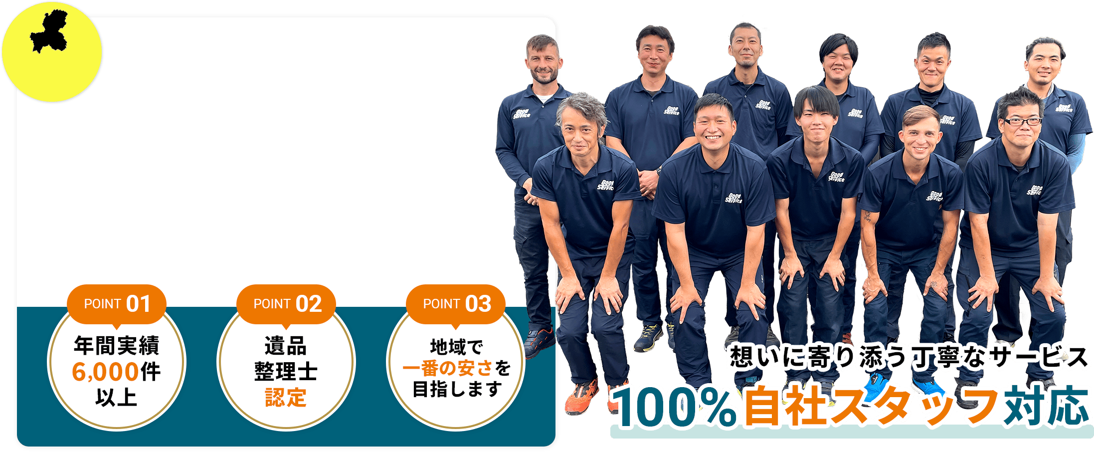 他の業者さんでは素人のアルバイトを雇ったり、忙しい時期には派遣社員を募集したりしています。グッドサービスではどんな時でも100%自社スタッフしかお客様の作業を行いません。