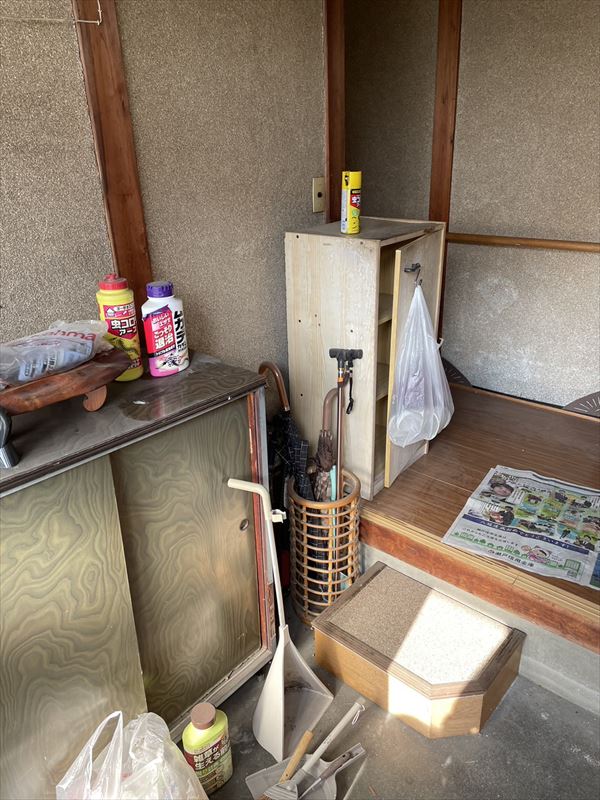 今回は名古屋市中村区にありますとあるマンションの一室です。 2LDKの間取りである程度ご家族にて片付けを済ませた状態でお呼びいただきました。 玄関です。 収納の中は脚立がある…