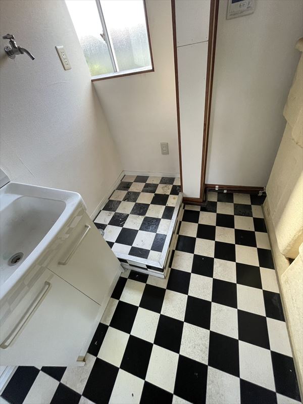 こちらには洗面台とおそらく洗濯機が置いてあったのでしょう、こちらも撤去します。