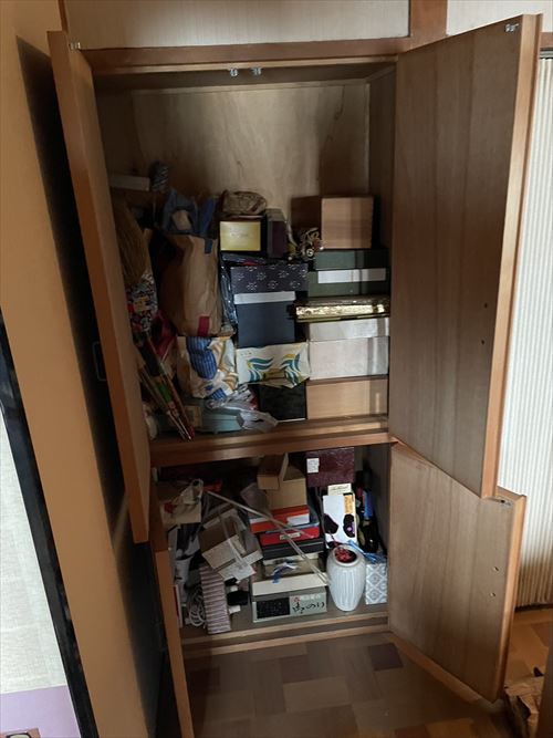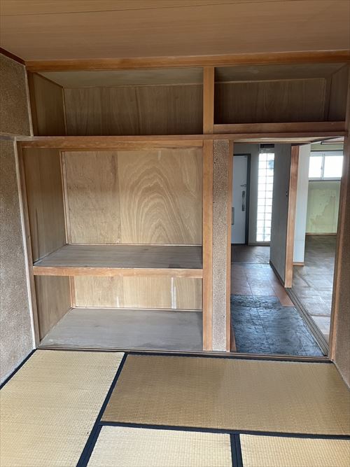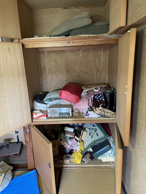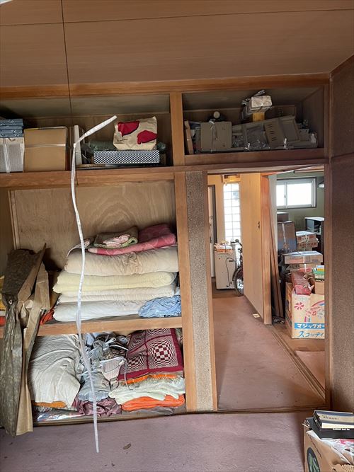 室内にはほとんど物がありませんでしたが押し入れ内には布団などが残ります。