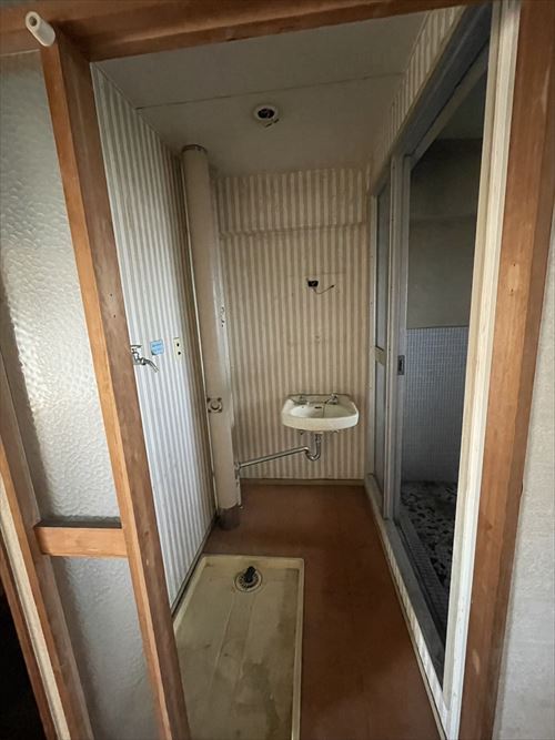 脱衣場です。仕切りにアコーディオンカーテンがありました。備品であれば残すべきですが、今回はリフォームの際に必要がないので撤去しました。